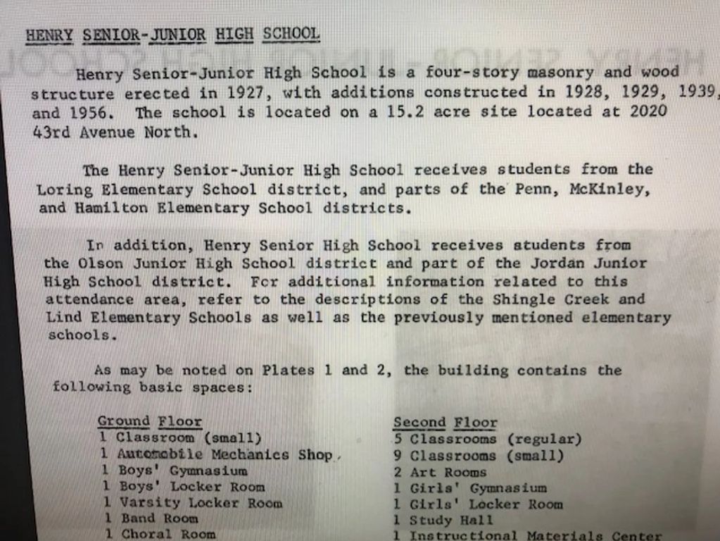 This document, created in 1962, is an "Educational Facilities Study" done by Michigan State University concerning Patrick Henry High School in Mpls.