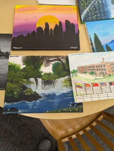 I'm sending you a picture of what they've done so far (they'll work more over summer break). The students prefer to not have pictures of themselves posted publicly, so I'll let their work speak for them. For now, I have two of their pieces hanging in a display case on the first floor near room 101; I'll keep the others safe from construction dust over the summer and hang them when we return.